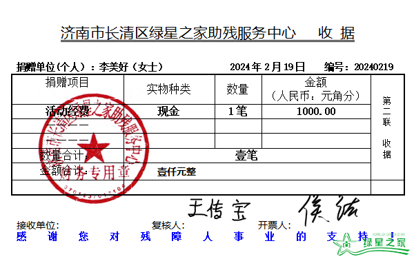 1.2月19日,济南李美好女士捐赠人民币1000元,用于活动经费;