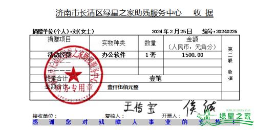 2.2月25日,济南刘女士捐赠办公软件一套,人民币1500元,用于办公;