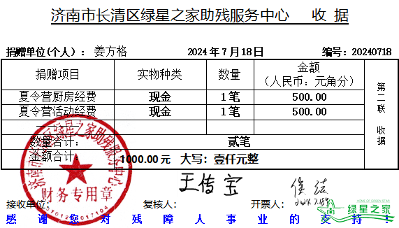 绿星之家助残服务中心收到二位热心人用的捐款,用于“梦想启航”夏令营活动经费。特此公示,并出具凭证。
