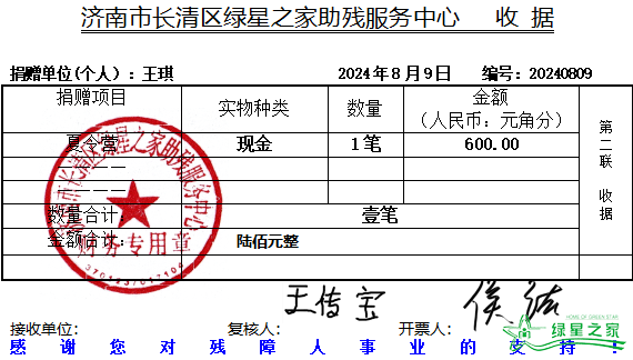 8月9日收到王琪同志600元捐赠,用于“梦想启航”夏令营。