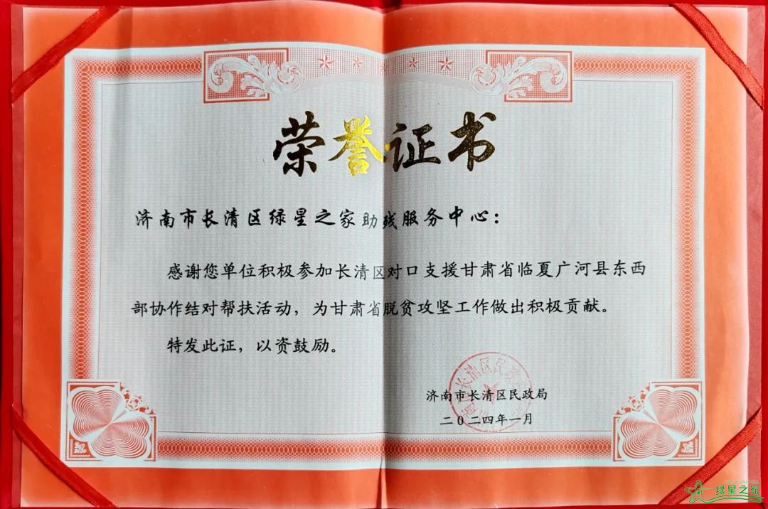 2024年1月18日,绿星之家助残服务中心积极参与长清区对口支援甘肃临夏广河县东西部协作结对帮扶活动,通过爱心捐赠为当地残疾人提供了支持,此举彰显了绿星之家助残服务中心勇于承担社会责任,得到了长清区民政局的认可与肯定并获了表彰。