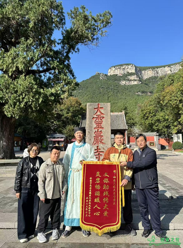 灵岩寺大客户经理吴振文、灵岩寺文旅推介官(网名:灵岩小书生)孙文章(左四、三)接受了绿星之家赠送的锦旗。